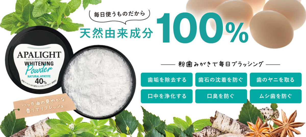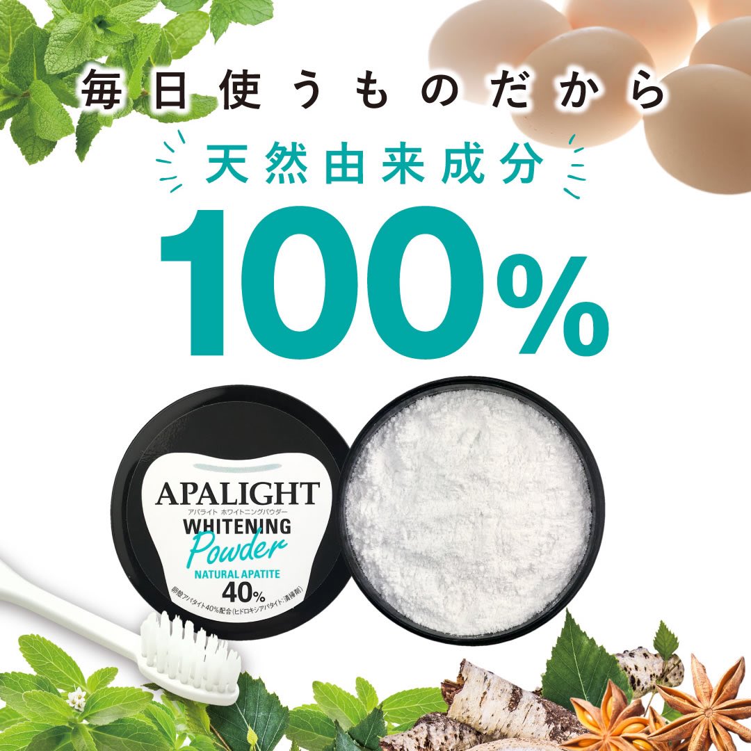 Bột trắng răng Apalight có nguồn gốc 100% tự nhiên và chứa 40% “apatit vỏ trứng”, là thành phần gần với men răng, giúp loại bỏ mảng bám thực sự mà không làm mòn răng.