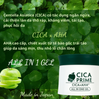 AHA thúc đẩy sự thay đổi của lớp sừng cũ và có tác dụng làm mịn da. Nó cũng có hiệu quả đối với da xỉn màu do khô, da có lỗ chân lông to và da thô ráp. CICA PRIME sử dụng AHA chiết xuất 100% từ táo, nhẹ dịu và an toàn cho da, với bộ 3 chiết xuất tối ưu hiệu quả: